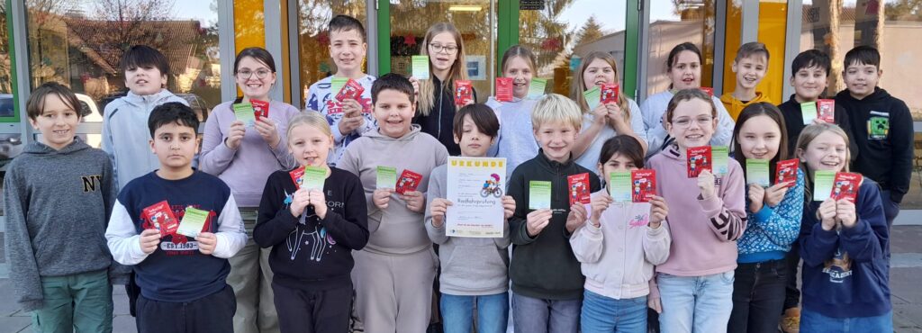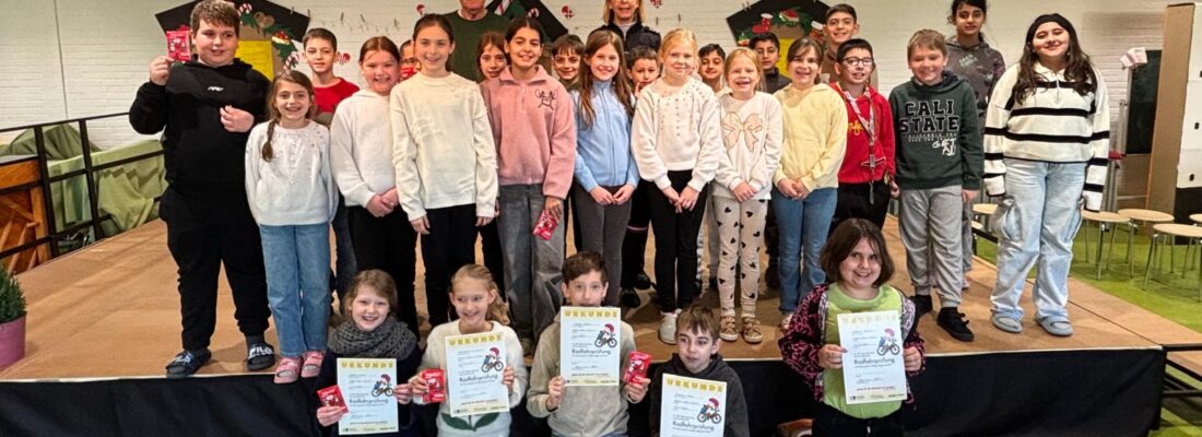 Im Dezember gab es für die Kinder der vierten Klassen als „Fitnessübung“ für die Teilnahme am Straßenverkehr das Radfahrtraining mit mehreren Übungseinheiten. Maßgeblich begleitet wurde dieses Training von der Verkehrswacht und der Polizei. So legten die Viertklässler heute, am 15.12.2025 mit Erfolg ihre Radfahrprüfung ab. Bei sonnigem Wetter zeigten sie, was sie gelernt hatten und fuhren sicher unter den kritischen Blicken der helfenden Eltern die Prüfstrecke ab. Zur Radfahrprüfung konnten einige Kinder sogar eine Auszeichnung erreichen. Herzlichen Glückwunsch!